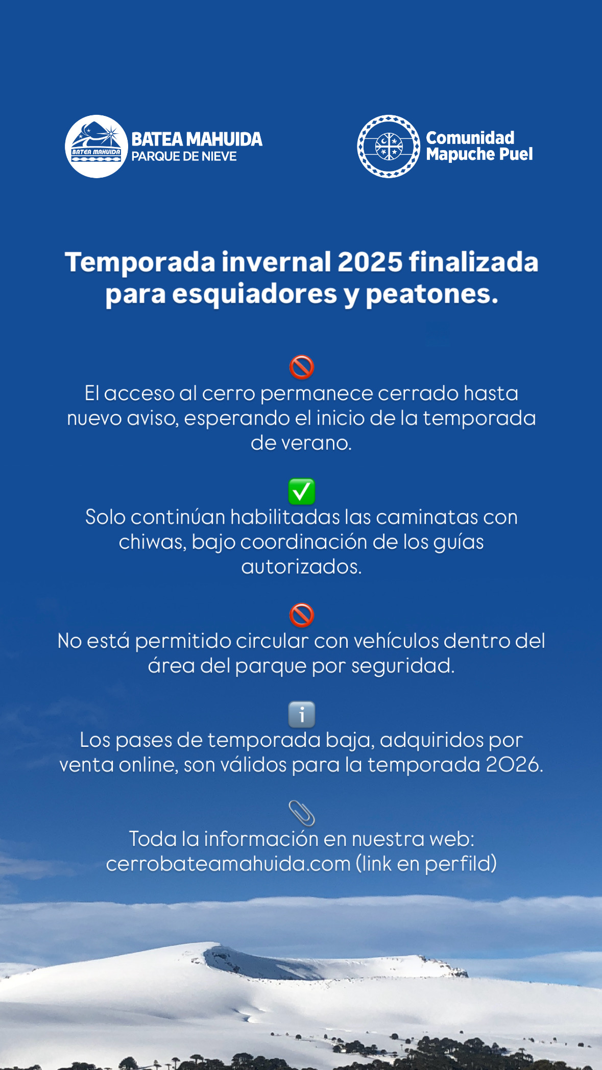 Temporada invernal 2025 finalizada. El Cerro se encuentra cerrado. Prohibida la entrada a toda persona no autorizada.