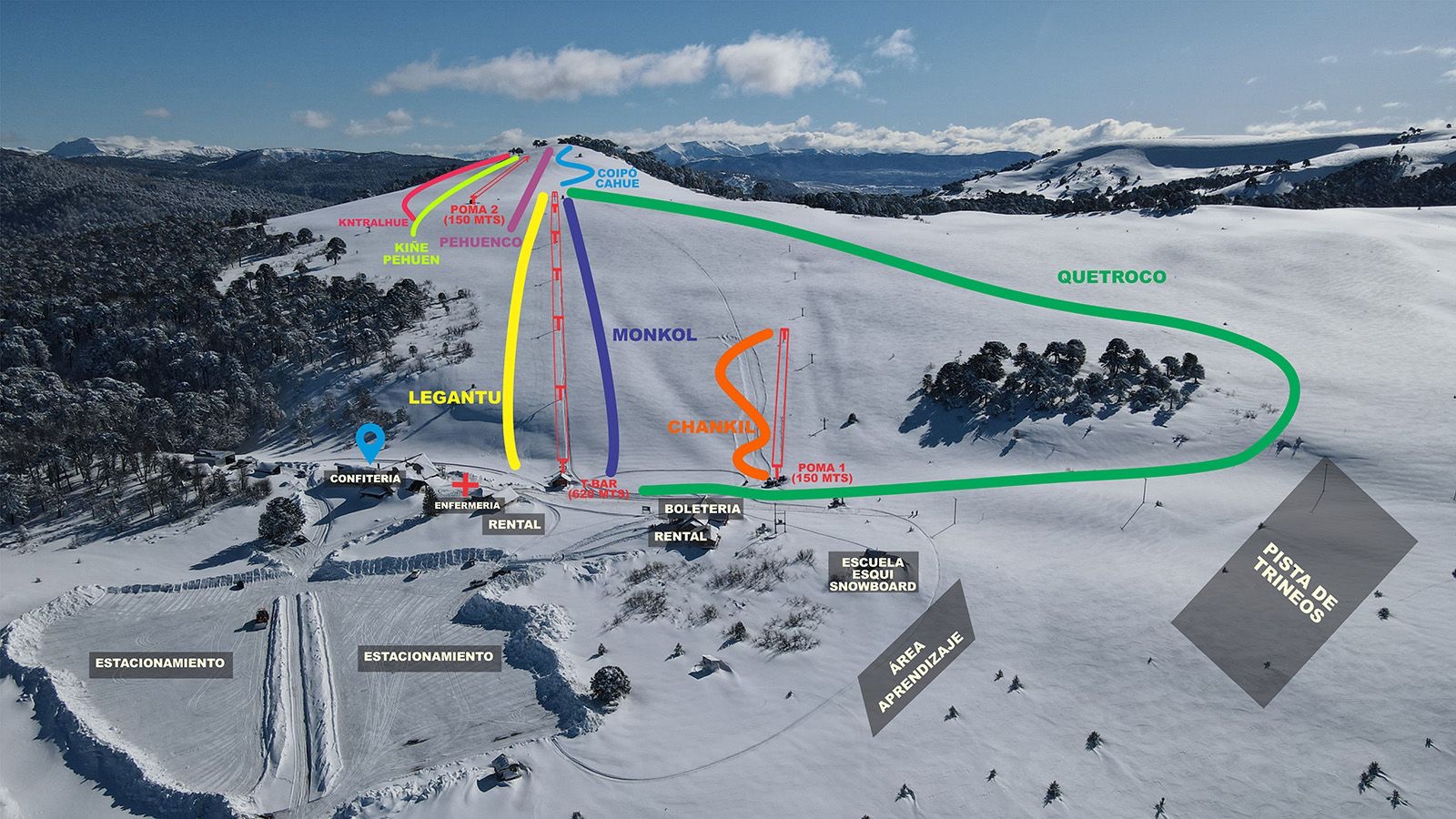 Los faldeos elegidos para la práctica de deportes son óptimos por su acumulación de nieve y el reparo del viento. La pista principal llamada Monkol (nombre cultural y natural del lugar donde esta el T-bar), de 700 metros de longitud, se encuentra a 1.700 metros sobre el nivel del mar.
